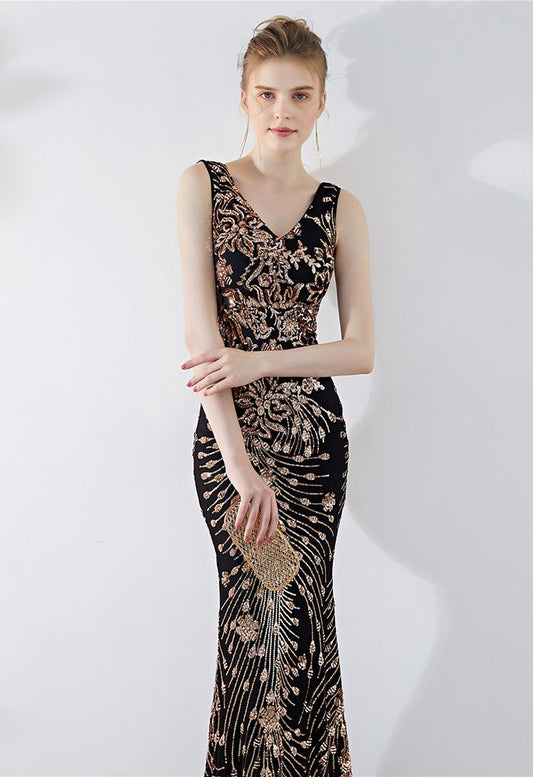 Vestido de sirena de malla con lentejuelas de vid floral en bronce