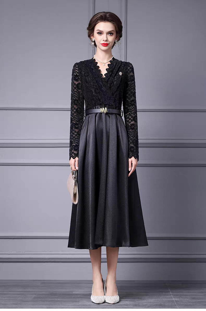 Vestido elegante, con encaje negro en blusa de manga larga, cuello en V, falda amplia corte A, con cinturón