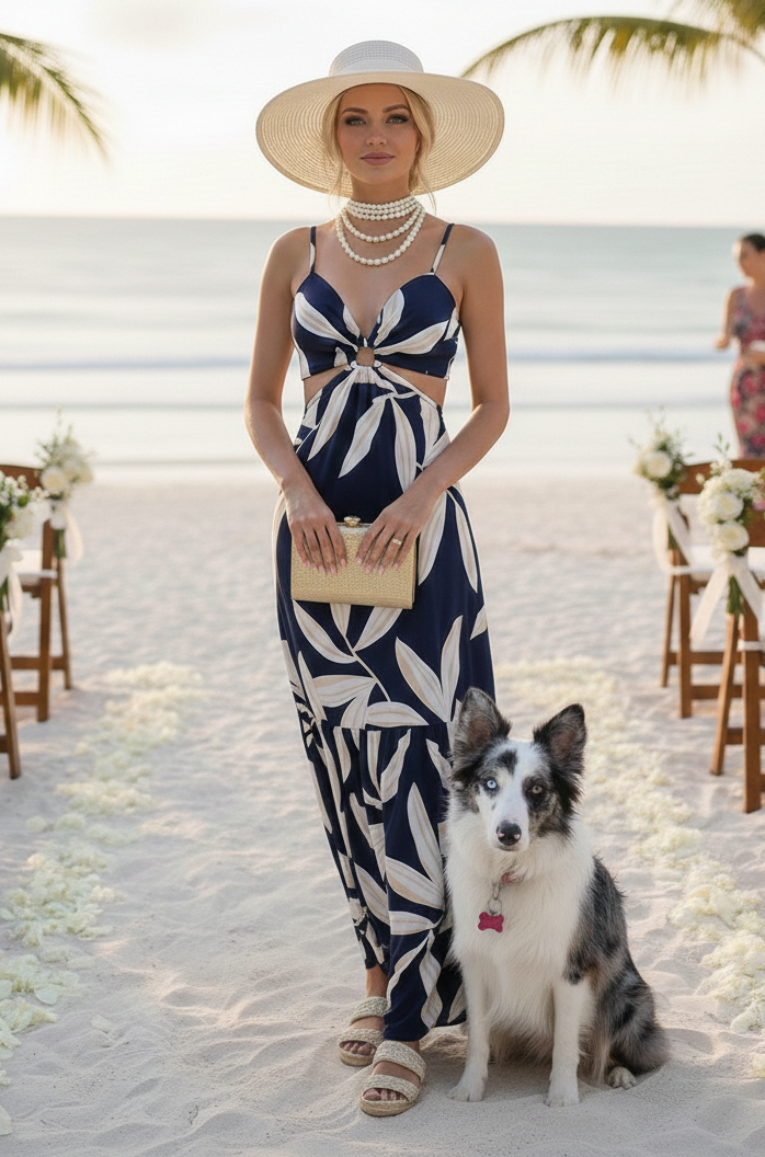 Vestido tirantes azul marino floral blanco, largo, hueco en cintura