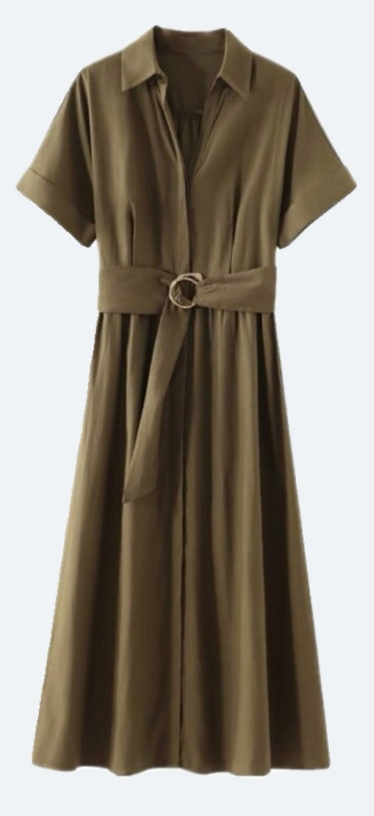 Vestido verde militar, manga corta, midi